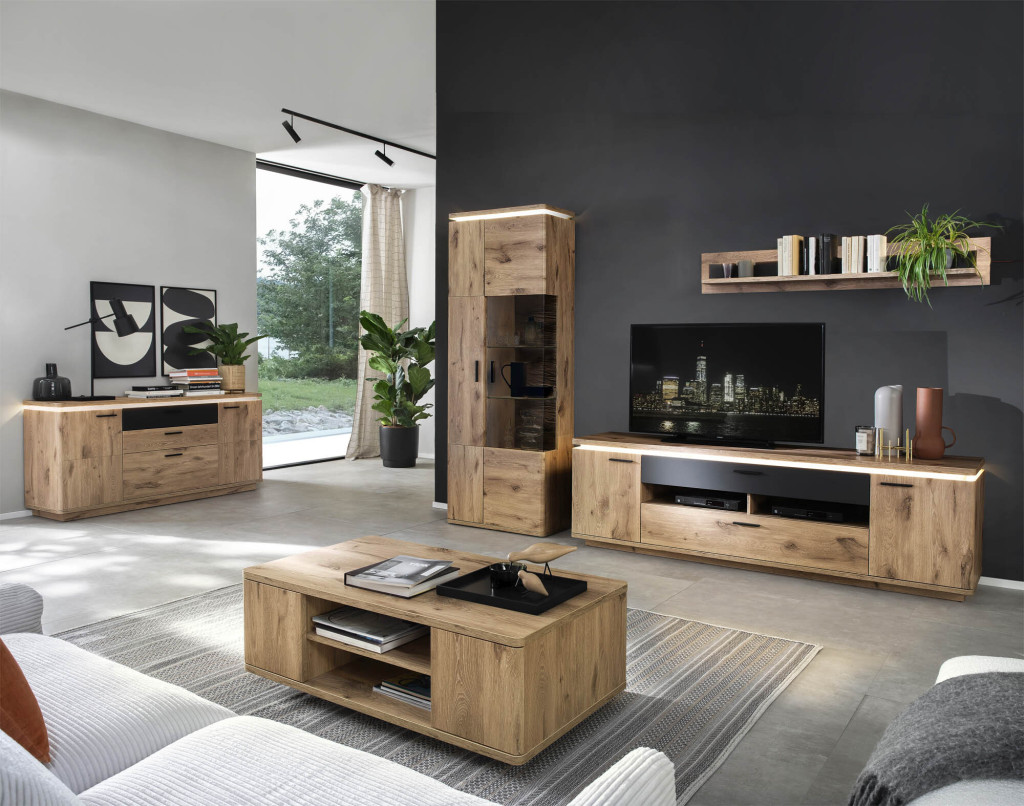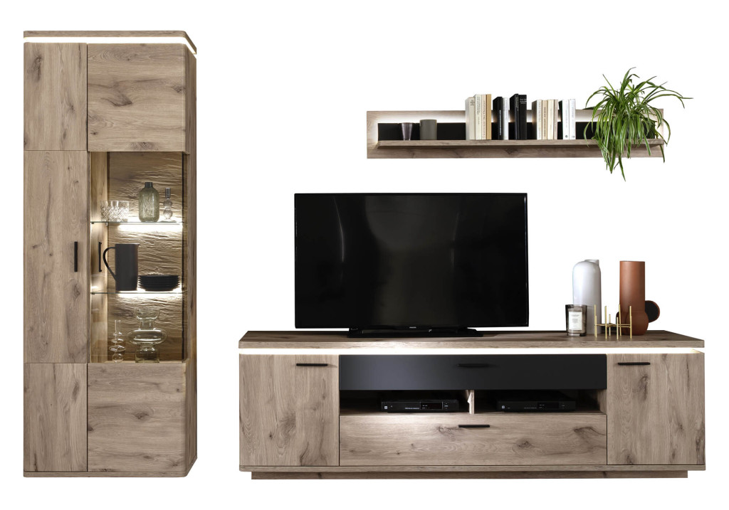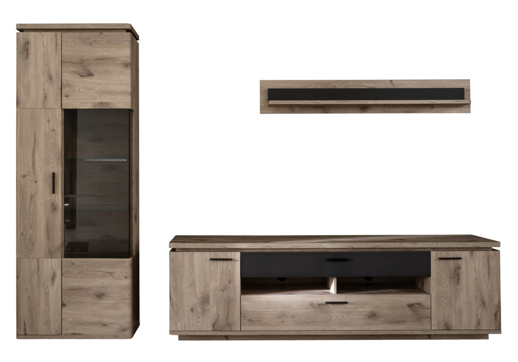 Front Viking oak / Frontabsetzung anthrazit, Korpus Viking oak Nachbildung, Frontglas Parsol grau, Glasböden Klarglas, Rückwand hinter Türen & Schubkasten Viking oak Nachbildung, Rückwand sichtbar 3D Viking oak sandgestrahlt Nachbildung, bestehend aus: