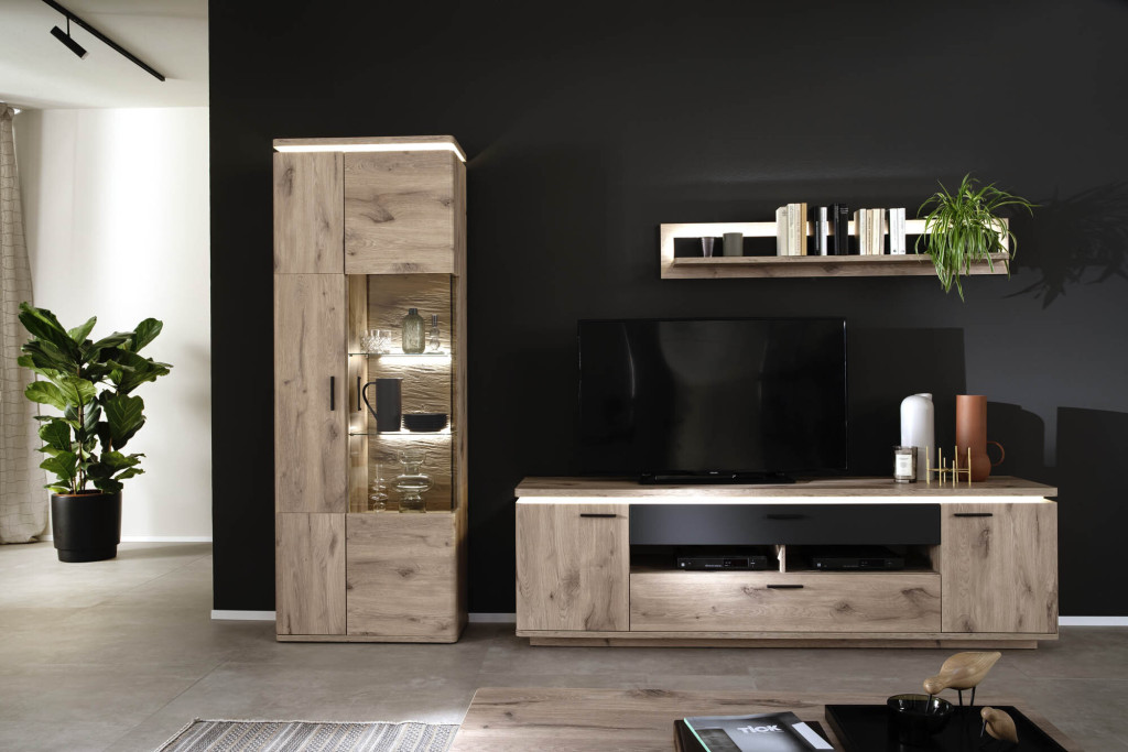 Front Viking oak / Frontabsetzung anthrazit, Korpus Viking oak Nachbildung, Frontglas Parsol grau, Glasböden Klarglas, Rückwand hinter Türen & Schubkasten Viking oak Nachbildung, Rückwand sichtbar 3D Viking oak sandgestrahlt Nachbildung, bestehend aus: